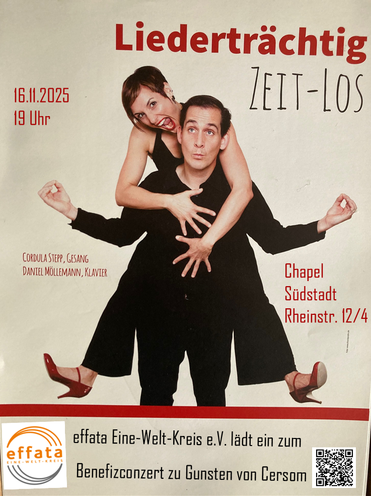 zu Gunsten der Gehörlosen-Schule "Cersom" in Bouffassou, Kamerun stattfindet. Zu Cersom hat effata über unsere Gemeinden eine persönliche Bindung und wir unterstützen die Arbeit der Schule schon seit einigen Jahren. Der effata-Vorstand lädt herzlich zu diesem Konzert ein.